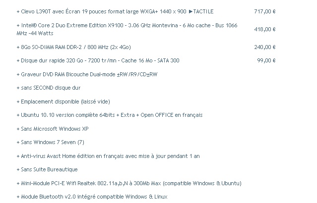 gigabyte Posté(e) le 12 janvier 2011 Share Posté(e) le 12 janvier 2011 (modifié) je vous propose un laptop clevo 15 pouce a 180.000da voici les spécifications ce laptop est configurer au choix les pièces sont bien sélectionner pour un total de 1440euro vous pouvez faire une simulation sur le site pour avoir une idée http://www.clevo.fr/ Modifié le 12 janvier 2011 par gigabyte Citer Lien vers le commentaire Partager sur d’autres sites More sharing options...