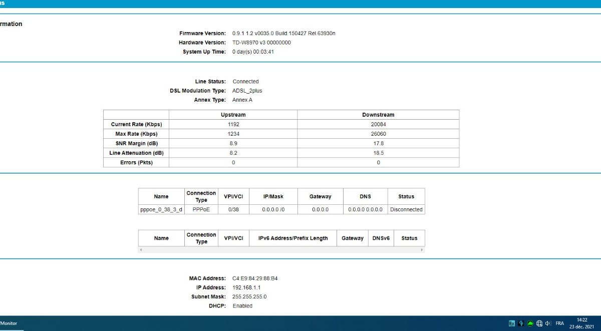 salem alikoum, bonsoir, regarder mes states a 14h22 pendant 5 min ? aprés LINK ADSL redémare et tous est redevenue comme avant ? je ne sais pas pour quoi MAIS ma situation n'a pas changer je download toujours entre 16MO et 15MO pas 20MO j'ai envoyé une réclamation très détaillé à l'arpce et le 07/01/2022 je relance une autre réclamation au directeur de mon agence avec plus de copie de states adsl et de mon débit