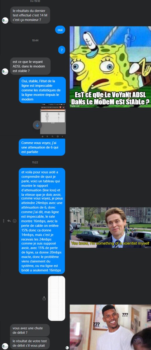 WaZz Posté(e) le 11 mars 2023 Share Posté(e) le 11 mars 2023 (modifié) c'est ca les agents "bien formé" qui ont reçu des awards pour leurs services du top? https://postimg.cc/7C0Zn5ZM je vous jure qu'ils suivent un script et ne savent absolument rien de quoi les gens parle, c'est la routine avec aux quand je veut resignalé mon dérangement, je me retrouve a chaque fois répété cette routine, mais vraiment, y a une historique de la conversation précédente...j'ai fini par leur envoyé, pour la millième fois, une nouvelle capture du speedtest, je vous laisse deviné leur prochaine réponse, facile a deviné parce que c'est scripté le tableau que j'ai envoyé: (they didn't bother reading of course) Modifié le 11 mars 2023 par WaZz 1 Citer Lien vers le commentaire Partager sur d’autres sites More sharing options...