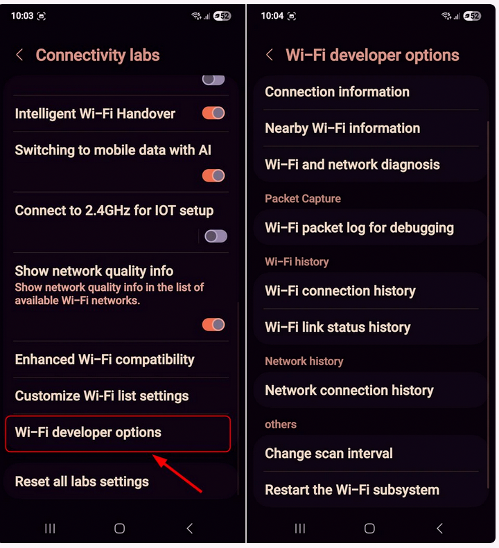 Modérateurs laliche Posté(e) il y a 2 heures Modérateurs Share Posté(e) il y a 2 heures Les utilisateurs d'Android connaissent bien les fonctionnalités cachées et les petites surprises amusantes que recèlent leurs appareils. Les téléphones Samsung Galaxy équipés de One UI 6, One UI 7, One UI 8 ou versions ultérieures disposent d'un menu caché appelé « Connectivity Labs » dans les paramètres Wi-Fi. Ce menu offre des fonctionnalités avancées telles qu'une commutation Wi-Fi/données mobiles plus intelligente, des diagnostics réseau, une cartographie de la puissance du signal et le filtrage des points d'accès. Tout comme pour accéder aux menus système cachés en saisissant des codes secrets ou en activant le mode développeur en appuyant sur le numéro de build , l'accès au menu Wi-Fi caché de Samsung nécessite une séquence spécifique. Quelques pressions au bon endroit suffisent pour révéler ce menu des Laboratoires de connectivité. Activation des paramètres de connectivité cachés de Samsung Exploration du menu des laboratoires de connectivité Paramètres Wi-Fi pour les développeurs Activation des paramètres de connectivité cachés de Samsung: Petit avertissement : Samsung masque volontairement ce menu car il contient des paramètres de connectivité avancés qui ne sont pas destinés à une utilisation quotidienne. Il est conçu pour les utilisateurs avertis, alors procédez avec précaution. Ceci étant dit, si vous êtes curieux et à l'aise avec l'idée, voyons comment le déverrouiller ! Révélation Ceci est un contenu masqué, merci de Se connecter ou S’inscrire Citer Lien vers le commentaire Partager sur d’autres sites More sharing options...