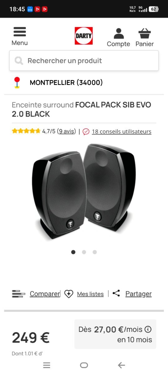 genio Posté(e) le 14 février Share Posté(e) le 14 février (modifié) A vendre 2 enceintes pour home cinema ou stereo avec support mural (jamais utilisé) Marque : FOCAL MODEL : SIB EVO PRIX fixe : 200 euros (pas en dinars cette fois) Lieu: alger centre Etat: peu utilisé - 9.5/10 Svp ne me contactez pas si vous ne savez pas ce qu'est ce produit. Modifié le 8 mars par genio etiquette Citer Lien vers le commentaire Partager sur d’autres sites More sharing options...